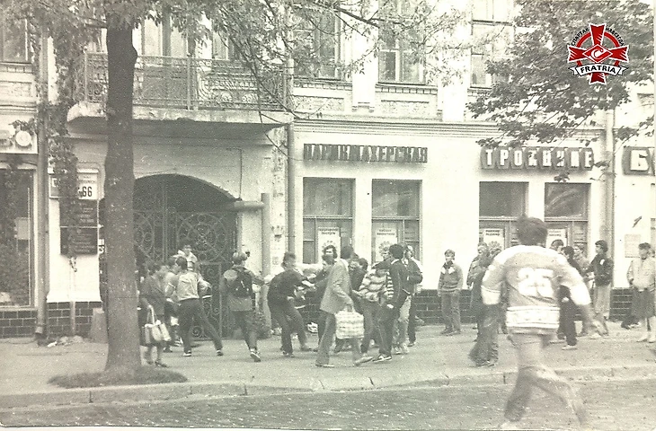 Какова экспрессия! Какой слог. Прям будто бы на минуту в Союз вернулся. И попал на комсомольское собрание, где разбирают возмутительное поведение, недостойное имени советского комсомольца. А теперь внимательно смотрим на заглавное фото, где спартаковские фанаты в день матча мутузят на Красноармейской улице неподалеку Республиканского стадиона своих коллег с динамовской символикой. Этот кадр появился у меня после публикации на моей страничке в Фейсбуке «Футбол від Санича. Прошлое и настоящее» статьи про операцию «Гости», которую провели весной 1988 года киевские власти с милицией, дабы не повторилось осенней бойни-1987. А приславший фото спартаковский фанат дал комментарий, мол, вот как мы круто динамикам на их же территории начистили рыла. Так что аплодируйте нам, восхищайтесь нами, какими мы были крутыми рысаками и ничего не боялись.