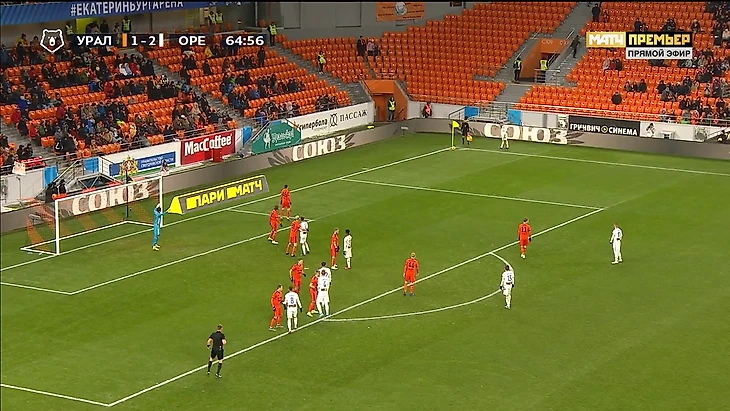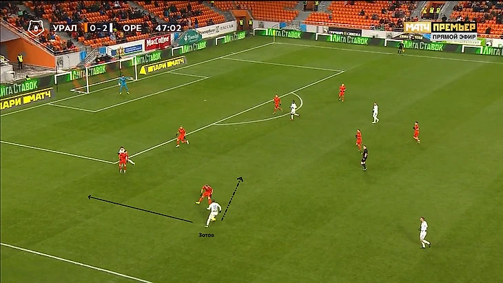 Матч предыдущего тура против «Урала». Зотов смещается в центр, хотя имеет возможность уйти влево, но так как он правша предпочитает смещаться в центр.