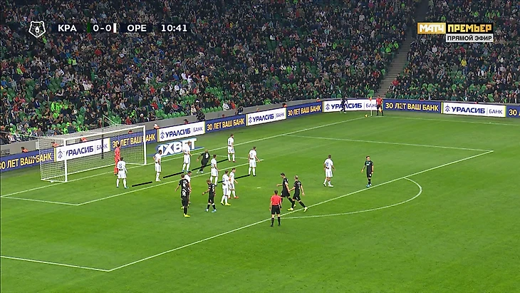 Нужно отметить, что в последних матчах на левом фланге у хозяев играет правша Зотов, поэтому во-первых, у него ожидаемо должны возникать проблемы с продвижением мяча на этом фланге, так как в его случае принять и сразу отдать нерабочей левой вперёд у него вызовет трудности, поэтому скорее всего он будет отдавать рабочей ногой в основном диагональные передачи, во-вторых, стоит ожидать от него смещений в центр, а не подач в штрафную. Например, как на скрине.