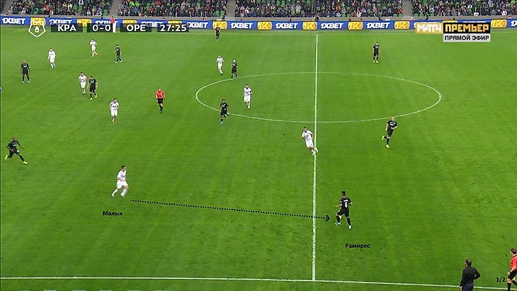 Малых начинает прессинговать Рамиреса, страховать его опускается Шахов, который оголяет приличную зону за собой. Через пару секунд ситуация повторится на другом фланге.