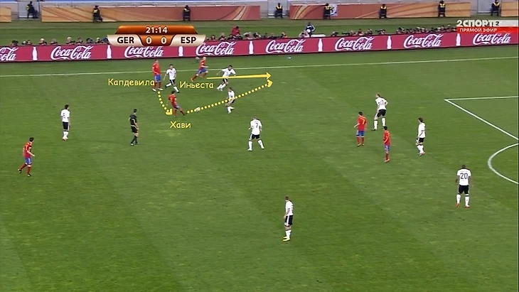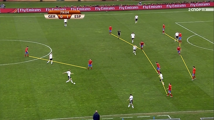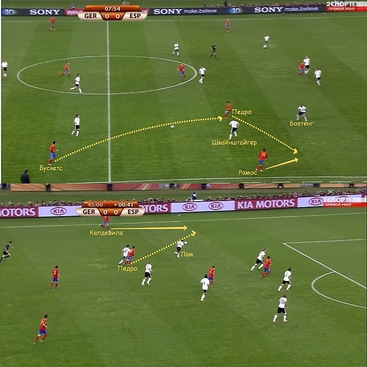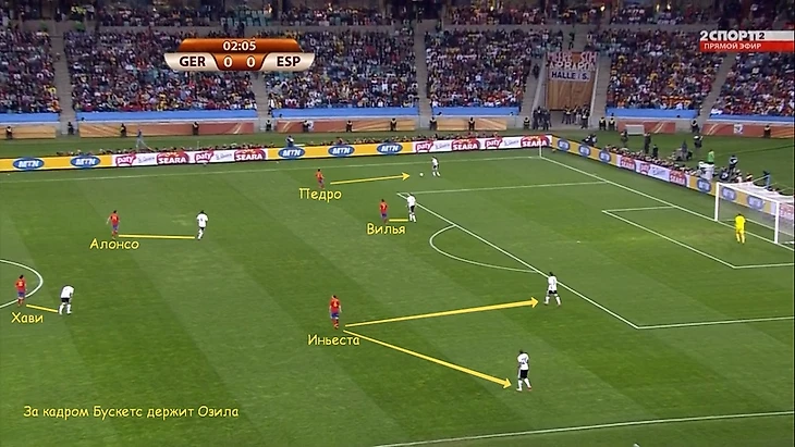 Хави, Хаби Алонсо и Бускетс дисциплинированно накрывали Швайнштайгера, Хедиру и Озила. Вилья атаковал ЦЗ, у которого находился мяч, что провоцировало передачи на фланги. Дальше в прессинг включался вингер. На дальнем от мяча фланге Иньеста готов был страховать партнеров в случае перевода. Испанский прессинг вынуждал немцев использовать дальние забросы или вообще передачи на Нойера.