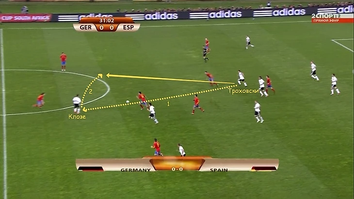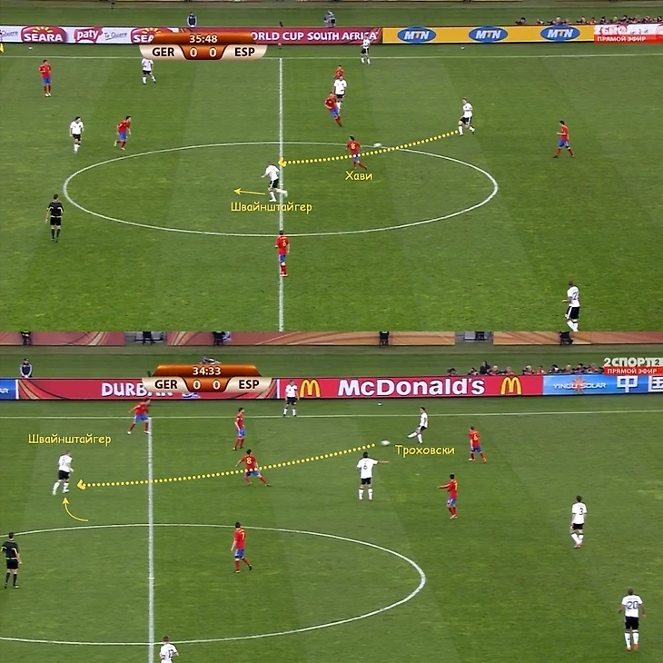 Немцы даже получили возможность для организации позиционных атак, ибо в центре уже не было такой плотности как в первые минуты матча. Бастиан Швайнштайгер несколько раз неплохо предлагал себя между линиями. Он ловил Хави на противоходе и открывался у него за спиной. Вот подобный эпизод еще из первого тайма: