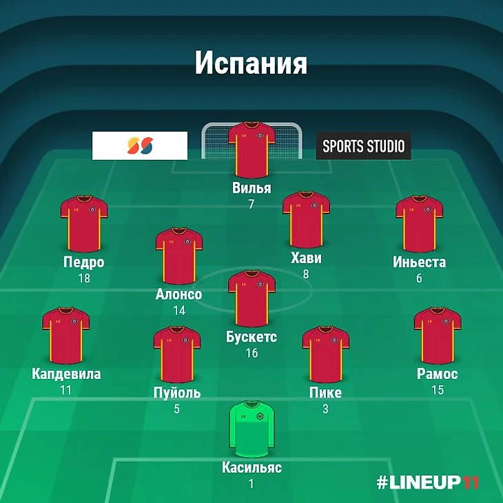 Расположение испанцев сложно было загнать в рамки одной конкретной схемы из-за динамичного перемещения центрального треугольника и постоянных смещений вингеров. Стандартное расположение в билд-апе больше всего напоминало 4-3-3 с глубинным плеймейкером Бускетсом и восьмерками Хаби Алонсо и Хави.