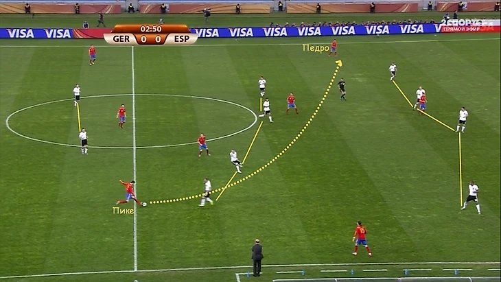 Пике на элитном уровне двигал мяч как через пасы низом, так и через диагонали. На примере ниже оборонительный блок сборной Германии сместился влево, и Пике выполнил перевод на Педро.