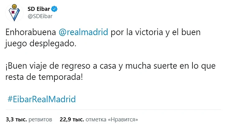 «Поздравляем «Реал» с победой и хорошей игрой. Желаем доброго пути домой и удачи в других матчах сезона!» — такое послание появилось на официальной странице «Эйбара» по окончании игры.