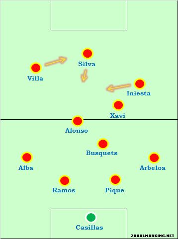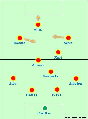 Теоретически, Силва как фальшивая девятка, и нападающий Вилья слева должны были облегчить проблемы Испании, связанные с двумя фланговыми игроками, смещающимися в середину, но на практике в некоторых случаях становилось только хуже. С глубокой обороной Англии, Вилья не чувствовал себя уютно, смещаясь за спину правого защитника – и вместо этого уходил в центр. Инъеста так же был в центре, и Силва, естественно, опускался глубже.