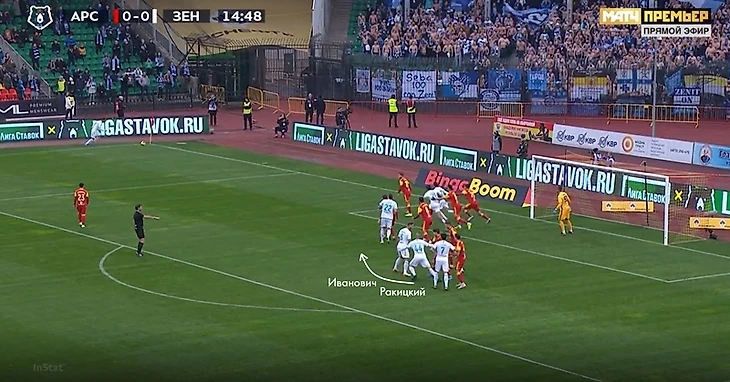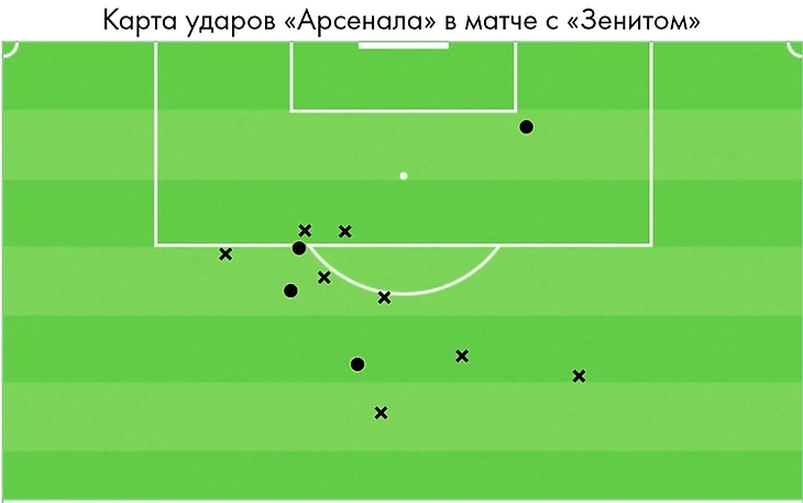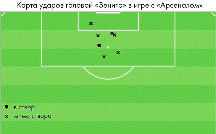 Доминированию «Зенита» в воздухе внутри чужой штрафной способствовали и качественные подачи – как со стандартов, так и после атакующих комбинаций. Из 18 навесов сразу 10 оказались точными (56% – абсолютный сезонный максимум), и большинство из них были удобны для нанесения акцентированных ударов, но в итоге в створ прилетел только один.