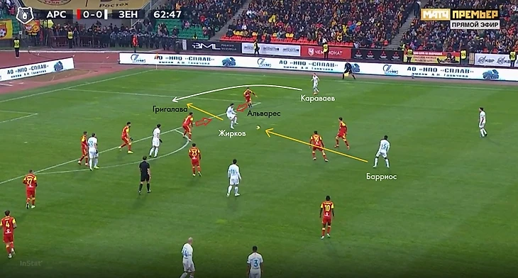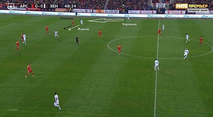 Идея разместить на флангах «разноногих» игроков, возникшая у Семака уже по ходу матча, вообще оказалась достаточно удачной и добавила атаке гостей вариативности. Жирков периодически смещался в центр под ударную левую, утягивая за собой Альвареса и освобождая бровку для включений Караваева.