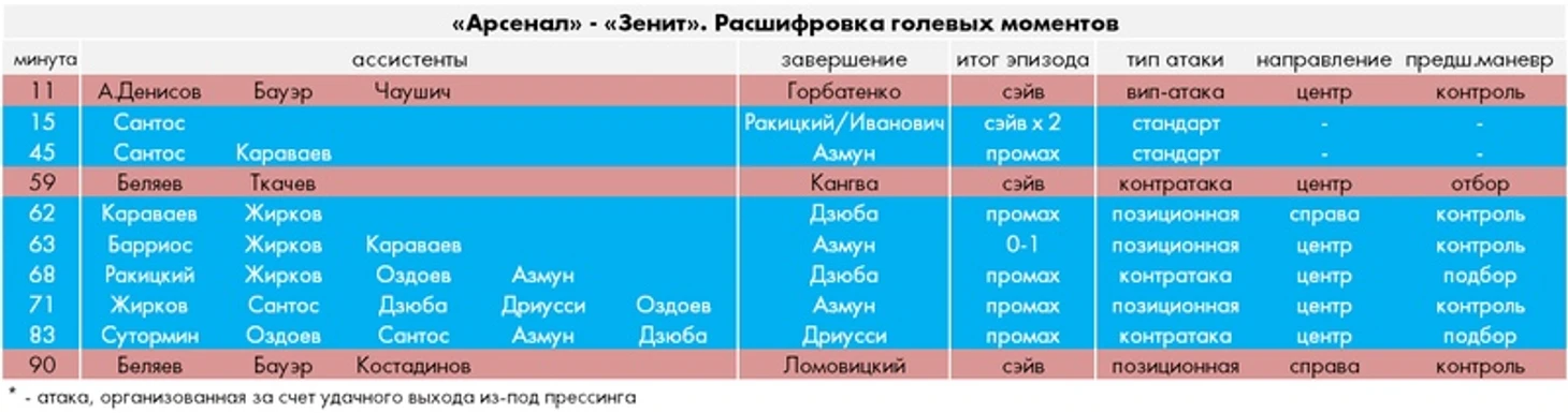 В концовке зенитовцы дважды образцово выбегали в вертикальные контратаки от своей штрафной, однако Дзюбе и тому же Дриусси не хватило хладнокровия в завершении. В обоих случаях туляки после потерь пытались организовать контрпрессинг, который гости легко сбрасывали за счет серии передач в одно-два касания.