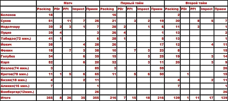 Не самый большой общий показатель у команды. Хочется остановить внимание на Карпе, который не так много принимает мяч, но очень хорошо обрезает соперника. Возможно, его стоит передвинуть чуть выше, потому что видно, как он старается находить игроков, выводить их в открытое пространство, и на позиции где сейчас играют Голубев и Фомин он бы мог получше показать свои эти качества.