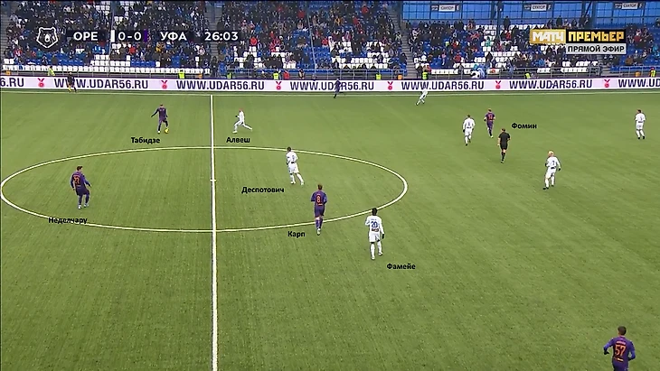 Не самая лучшая расстановка в атаке для продвижения мяча - на левом фланге сразу три игрока, а в середине никого нет. Как мне кажется «Уфа» могла бы получить превосходство, если бы наоборот создавала численное преимущество в центре. Там изначально была ситуация 3 против 2, поэтому продвигать мяч через центр должно было быть проще.