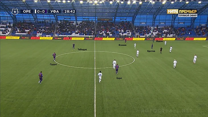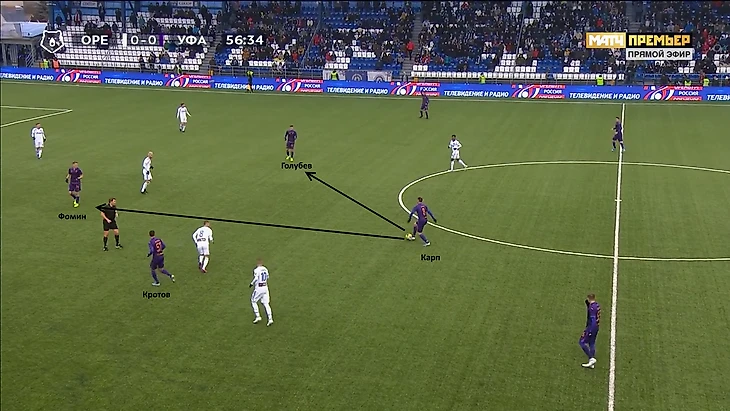 Это не создавало проблем «Уфе» при розыгрыше мяча потому что, во-первых, прессинг «Оренбурга» был не столь интенсивным, чтобы заставить ошибаться соперника, во-вторых, чтобы помочь защитникам мог опуститься пониже Карп. Атаки «Уфы» строились в основном через забросы, быстрые выходы в атаку, рывки Сухова, попытки пройти центр поля через фланг. Например вот как полузащитники обеспечивают широту в атаке.
