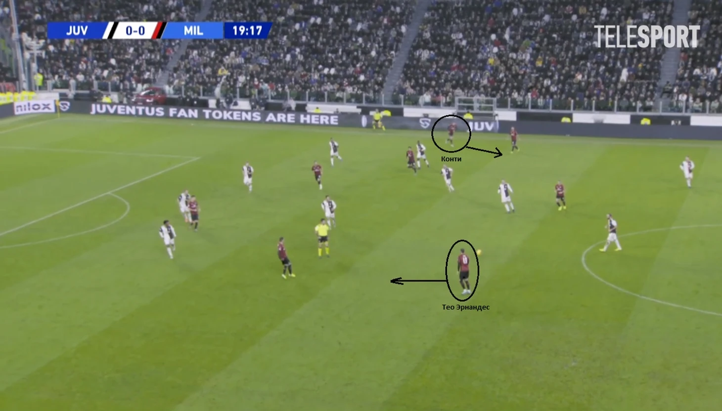 Пример №1. Матч против "Ювентуса", 19 минута - "Милан" строит позиционную атаку. Как только Сусо проталкивает мяч вперед на забегающего Конти, Тео моментально принимает решение возвращаться в оборону.