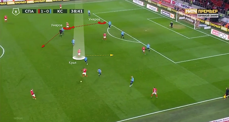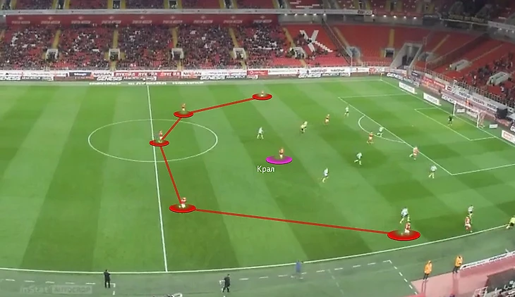 Такая структура позволила «Спартаку» найти баланс между атакой и обороной, а также замаскировать нехватку сильного опорника-разрушителя. Практически не встретишь эпизодов, где Крал противостоит быстрому оппоненту на пространстве – как правило, он встречает его в момент, когда тот не набрал скорость. А в статичном отборе чешский полузащитник очень приличный.