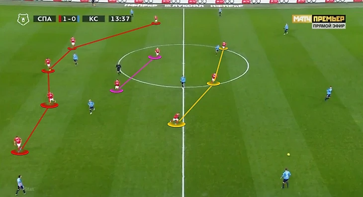 Только важно понимать, что это тоже неидеальная структура. В данном случае «Спартак» отдаёт инициативу при проведении атаки сопернику, не направляет его наступления в определённые зоны, а позволяет выбирать из собственных предпочтений, не заставляет торопиться и ошибаться. Плюс из-за необходимости выдерживать горизонтальную дистанцию между двумя опорниками и одновременно высокого расположения атакующей тройки часто остаётся свободным игрок в дальнем от мяча полуфланге. Эта проблема проскакивала и с «Локо», и с «Ростовом», и с «Крыльями». Тут необходима работа Тедеско: представители атаки должны быстрее переключаться и опускаться на помощь опорникам, ситуаций «2 в 3», как в Черкизово, в зоне подбора возникать не должно.