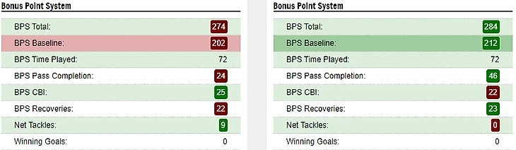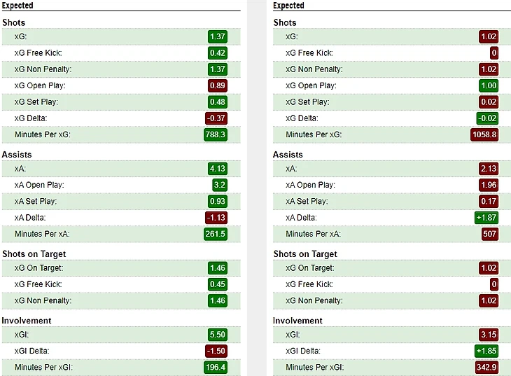 Тут у наших испытуемых фактическое равенство по всем показателям. Единственное различие это ассисты: у Арнольда один из них это фентези-ассист, что, впрочем, влияет только на официальную статистику. Для FPL никакой разницы нет. Поэтому оба игрока заслуженно получают по одному очку.