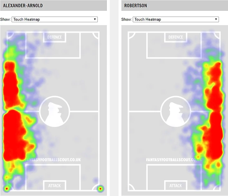 Из-за похожих позиций на поле у Робертсона и Арнольда похожие и показатели на тепловой карте касаний. У Трента только бросаются в глаза 2 точки на угловых, но об этом дальше. А в этом блоке оба игрока получают свои заслуженные баллы.