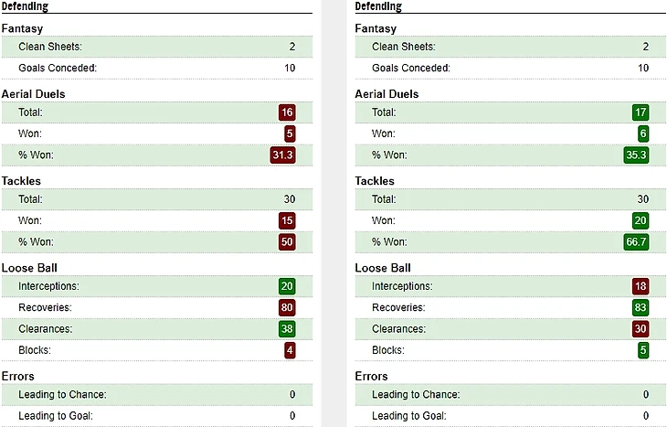 В этом блоке с небольшим перевесом в большем количестве показателей одерживает победу Робертсон. Хотя и по защитным показателям показывают примерно одинаковые результаты.