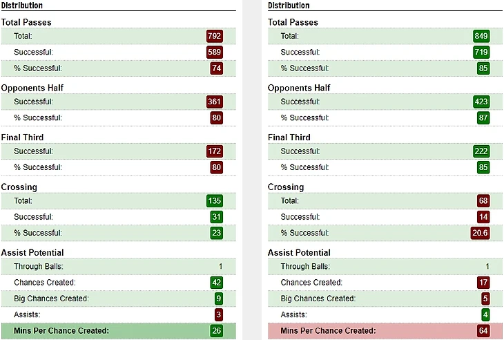 Александр-Арнольд – 1,37 xG, 4.13 xA, 447 касаний в финальной трети, 172 из 242 передач в финальную треть успешны, 26,9% успешных обводок (7 из 26 попыток), 23% успешных навесов (31 из 135), 42 шанса создано, 9 голевых шансов создано, 26 минут в среднем на один созданный шанс.