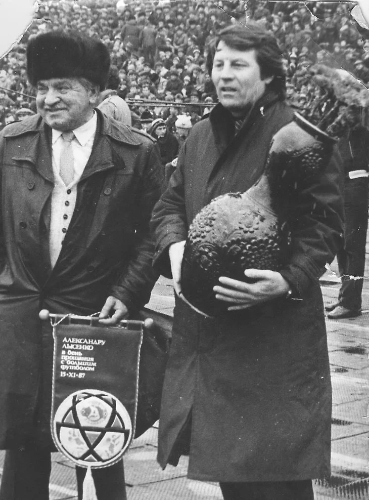 Еще аплодировали 15 000 зрителей на «Метеоре» Александру Лысенко, которого провожали из большого футбола. Шутка ли, он 11 лет верой и правдой пахал в «Днепре» (1977 – 1987), проведя за это время 258 матчей и 23 гола. Перед матчем чемпиону СССР-1983 вручили памятные призы начальник команды Геннадий Жиздик и старший тренер Евгений Кучеревский (на втором фото). У меня всегда такие торжественные мгновения вызывают грусть. Ведь уходят большие мастера, которые своей ИГРОЙ заслужили на такие всенародные проводы.
