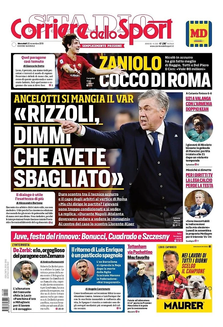 Анчелотти сожрал ВАР. Жёсткая схватка между тренером Адзурри и главой арбитров на встрече в Риме. «Но кто управляет матчами? Молодёжь находится под слишком большим влиянием и это видно». Ответ: «В ходе матча «Наполи»-«Аталанта» арбитр должен был отправиться посмотреть повтор». В центре конфликта столкновение Льоренте-Кьяер.