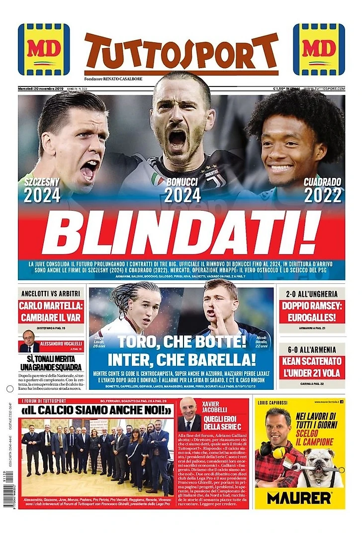 «Юве» укрепляет будущее, продлевая контракты с тремя звёздами. Официально объявлено о продлении контракта с Бонуччи до 2024, скоро состоятся также подписания со Шчесным (2024) и Куадрадо (2022). Рынок, операция Мбаппе: настоящая опасность – это шейх «ПСЖ».