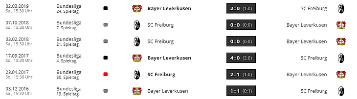 «Байер» непобедим последние шесть домашних матчей в Бундеслиге против «Фрайбурга». В последний раз на «БайАрене» шварцвальдскому клубу удалось выиграть в марте 2012 года, когда Юлиан Шустер и Даниэль Калиджури своими голами привели команду к победе 2:0.