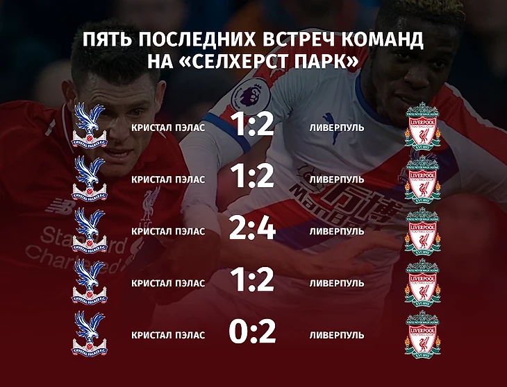 Тут все довольно хорошо для красных. Но «Пэлас» умеет побеждать «Ливерпуль». Именно они нанесли последнее поражение подопечным Клоппа на «Энфилде» в рамках АПЛ (23 апреля 2017 года), прощальный матч Джеррарда на родном стадионе также был омрачен победой «стекольщиков», ну и, конечно же, тот самый камбэк в конце сезона 13/14.