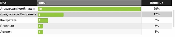 По данной статистике можно явно понять, что Лестер любит владеть мячом. Практически 60% голов команда забивает из длительных атакующих комбинаций (более 6 секунд). Так же команда даже в сложные моменты старается не прижиматься к своим воротам и соблюдать средний компактный блок в защите ( 44% действий произошло именно в центральном секторе во всех матчах лестера этого сезона).