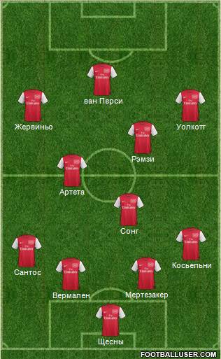 "Арсенал" (4-2-3-1): Щесны - Косьелни, Мертезакер, Вермален, Сантос - Сонг, Артета, Рэмзи - Уолкотт, Жервиньо, ван Перси.