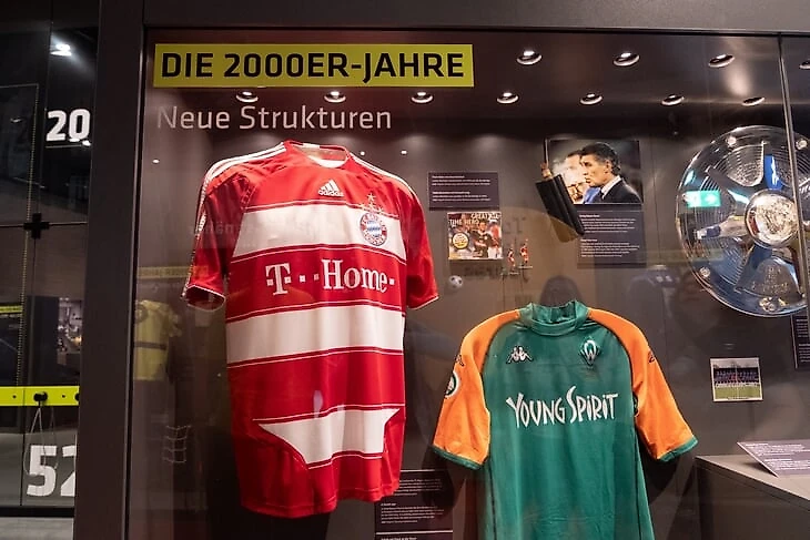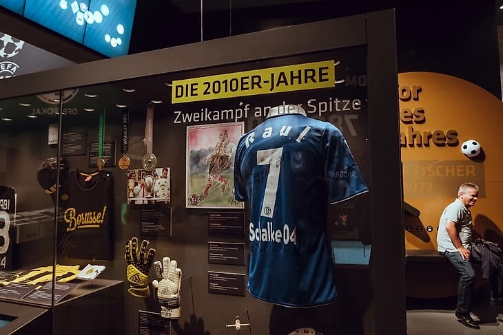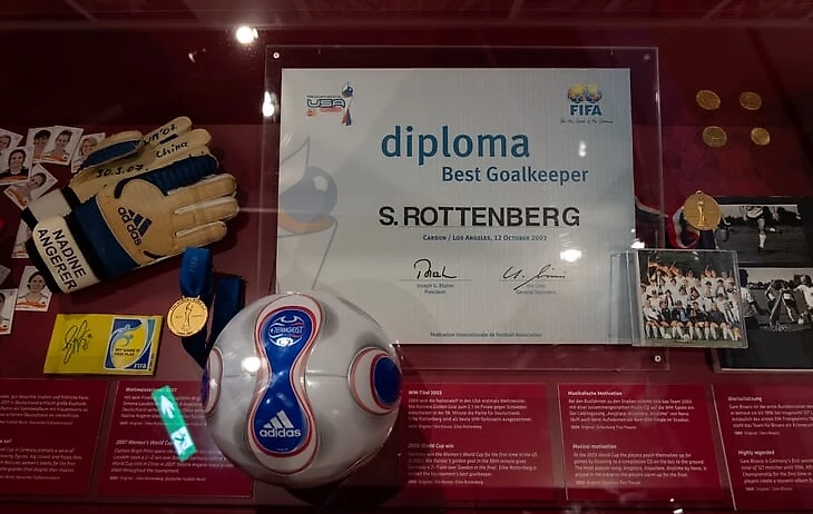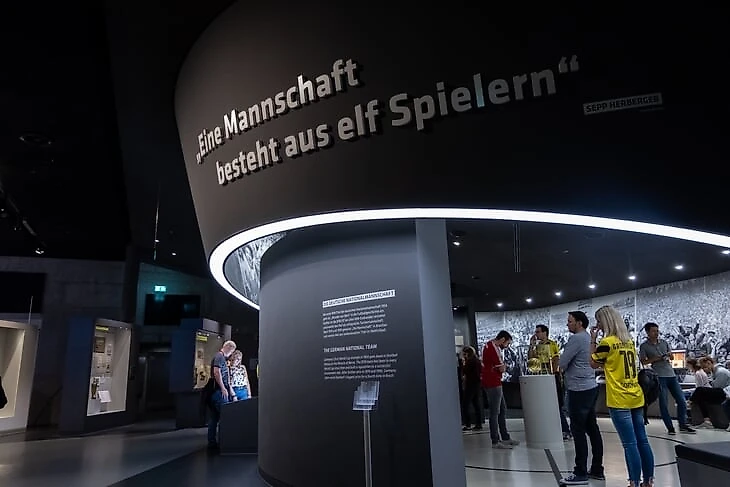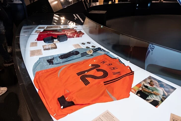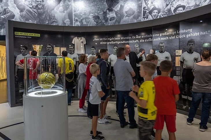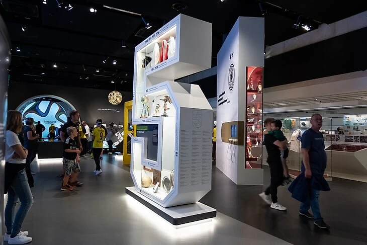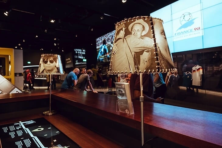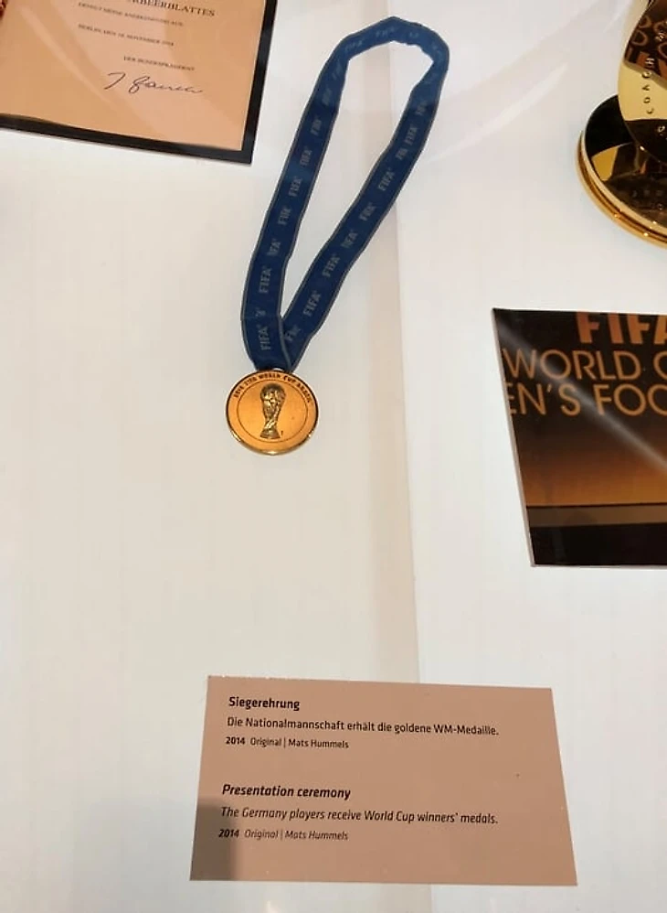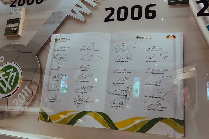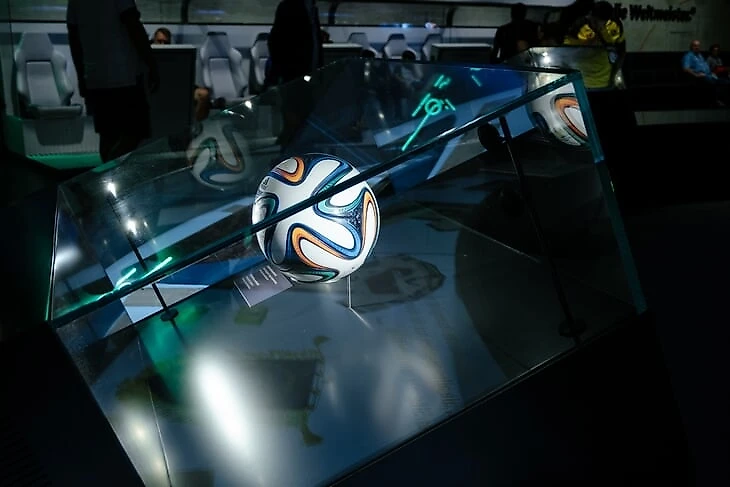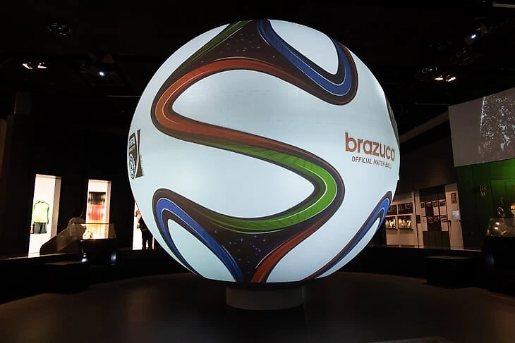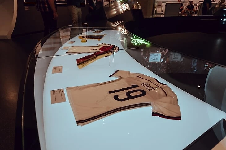 На огромном мяче показывают видео о ЧМ в Бразилии с Йоги Левом, Оливером Бирхоффом и игроками. Вокруг этого круглого экрана витрина с такими экспонатами, как бутса Марио Гетце с финального матча, медаль чемпиона мира Матса Хуммельса, формы вечных соперников Кана и Леманна.