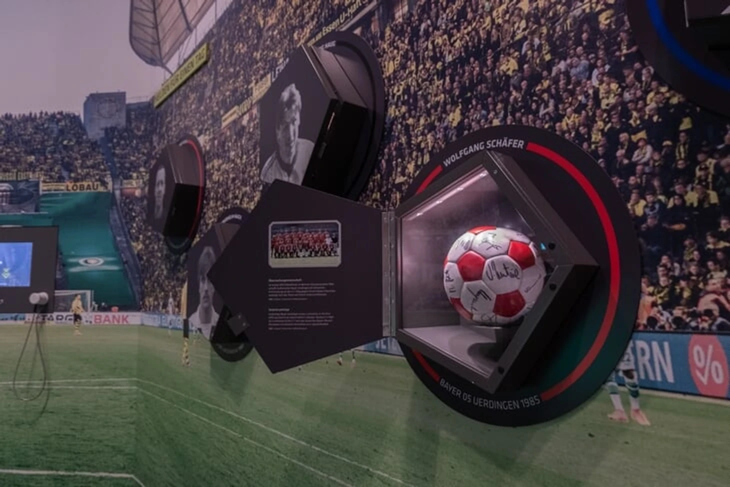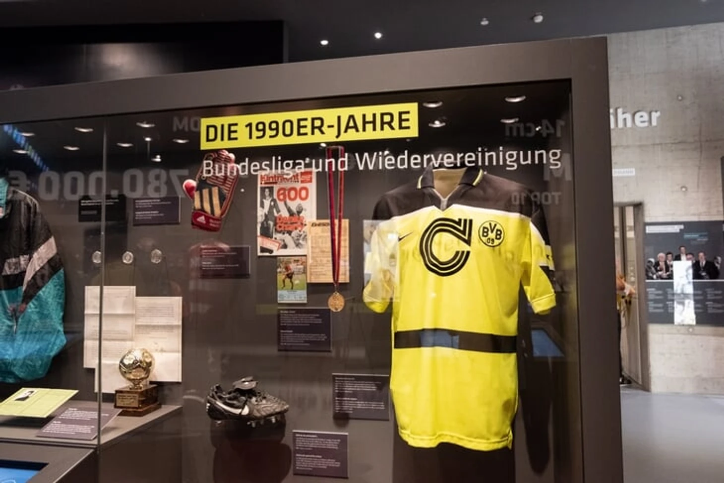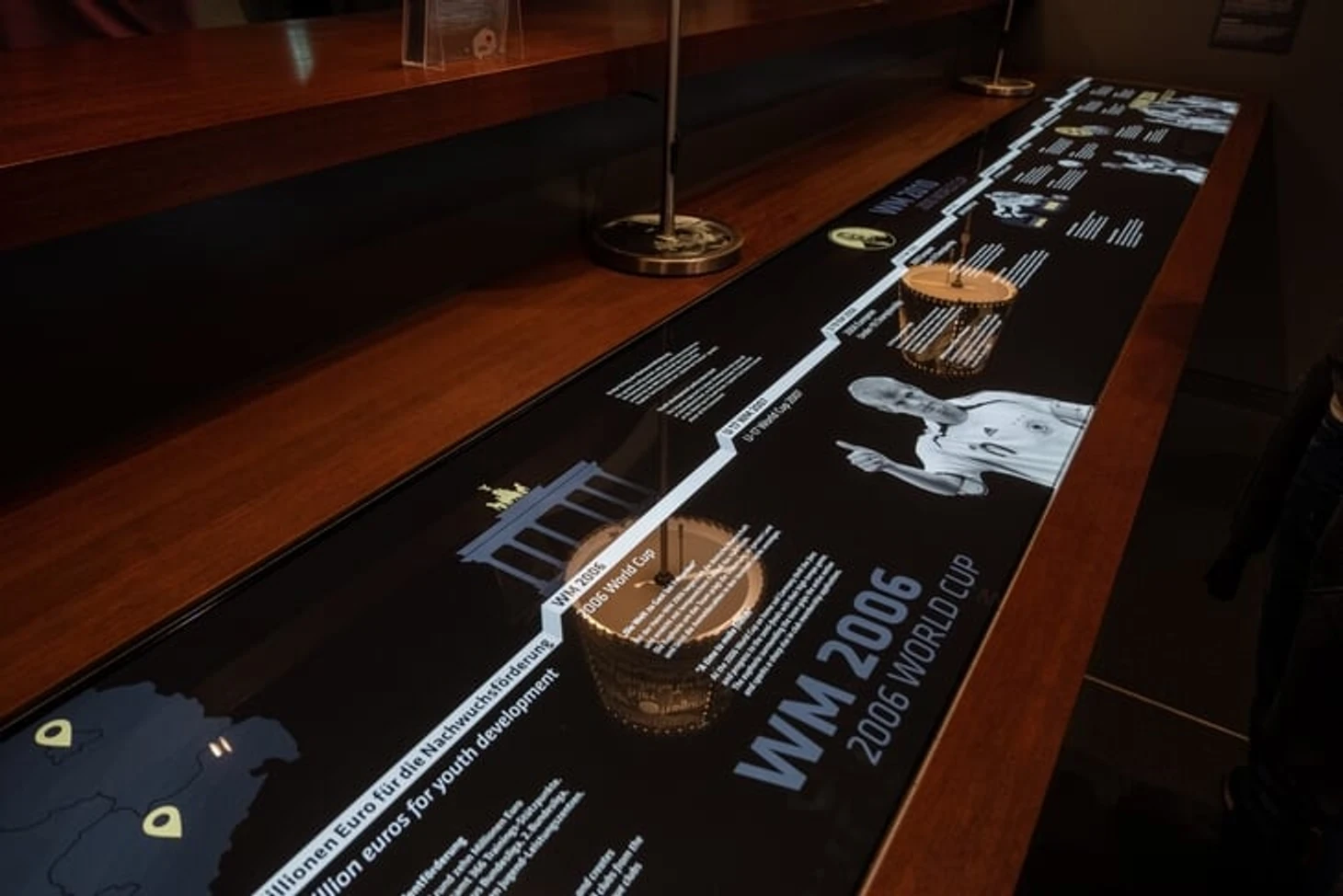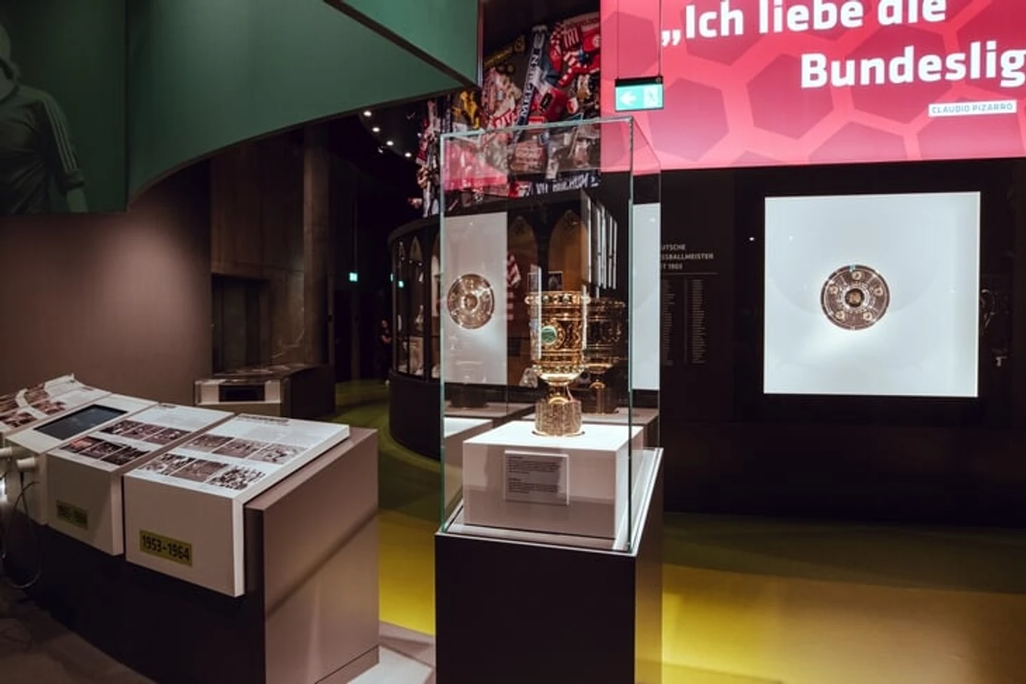 На огромном мяче показывают видео о ЧМ в Бразилии с Йоги Левом, Оливером Бирхоффом и игроками. Вокруг этого круглого экрана витрина с такими экспонатами, как бутса Марио Гетце с финального матча, медаль чемпиона мира Матса Хуммельса, формы вечных соперников Кана и Леманна.