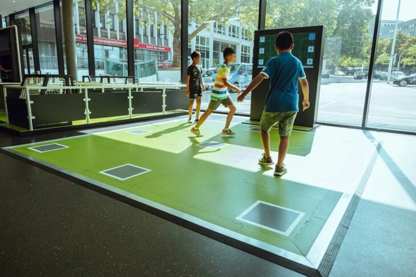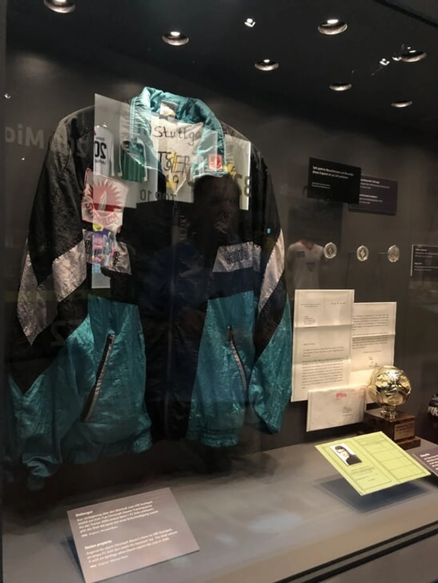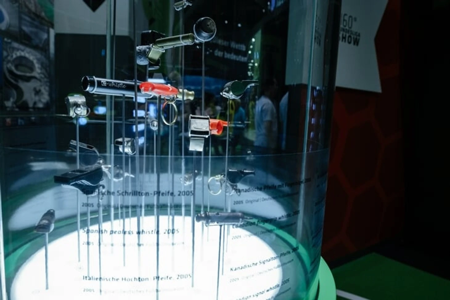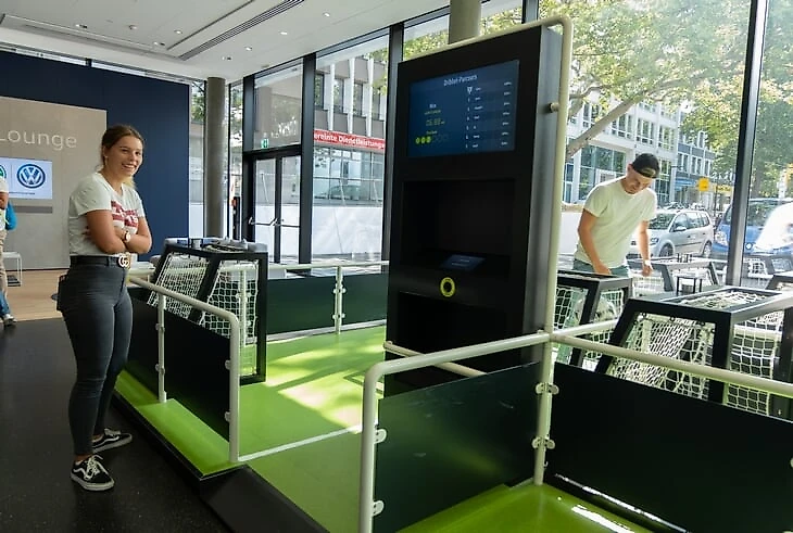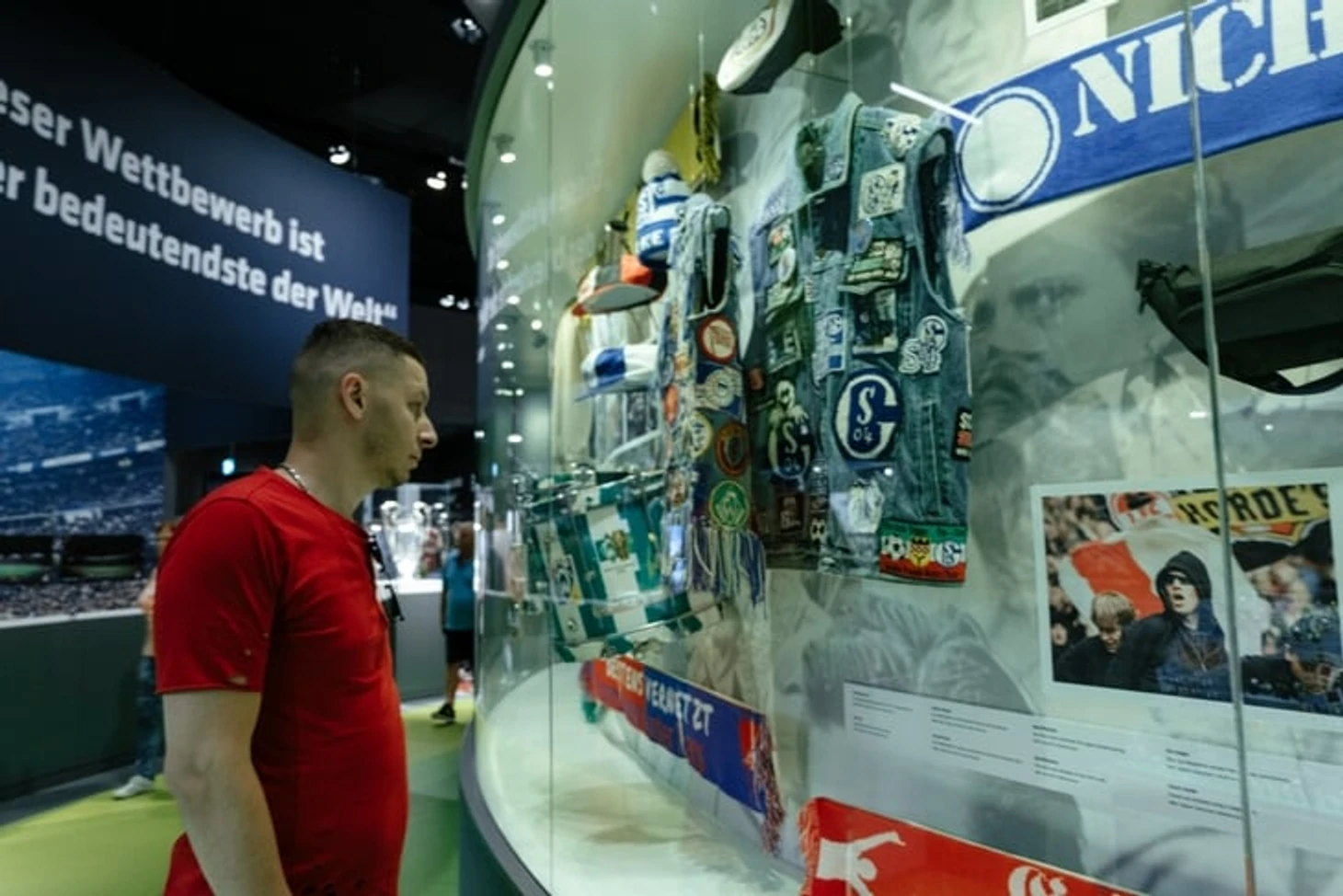 На огромном мяче показывают видео о ЧМ в Бразилии с Йоги Левом, Оливером Бирхоффом и игроками. Вокруг этого круглого экрана витрина с такими экспонатами, как бутса Марио Гетце с финального матча, медаль чемпиона мира Матса Хуммельса, формы вечных соперников Кана и Леманна.