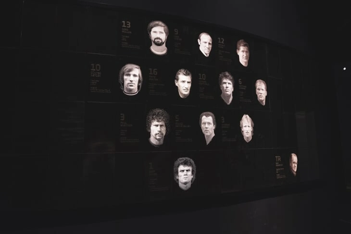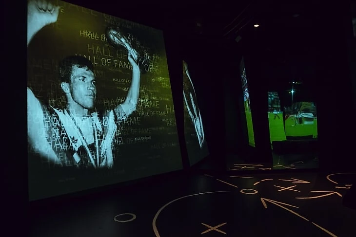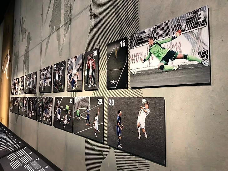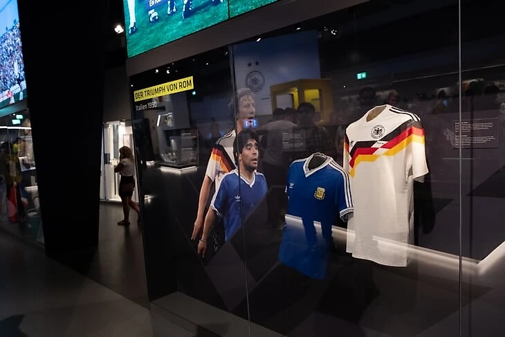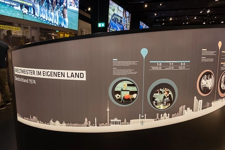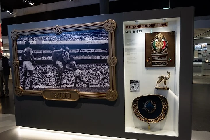 В другой половине зала – самые знаковые моменты в истории сборной ФРГ. Путь к первому титулу в 1954 году, гол Джеффри Херста в финале ЧМ-1966, полуфинал ЧМ-1970 против Италии в Мексике, финал ЧМ-1974 против Нидерландов, в котором победный гол забил Герд Мюллер.