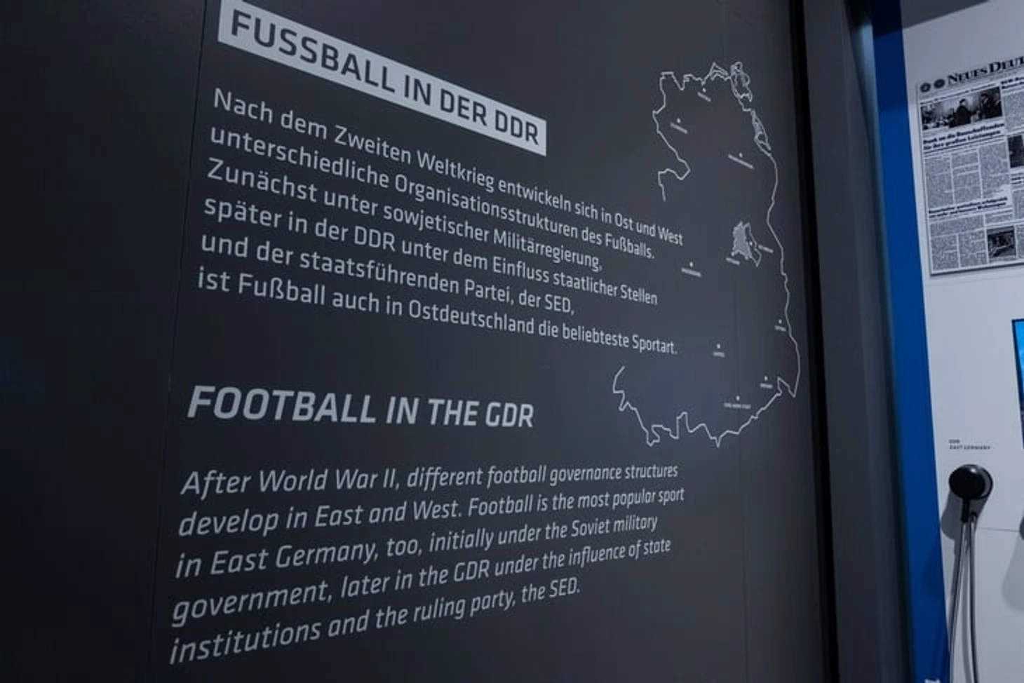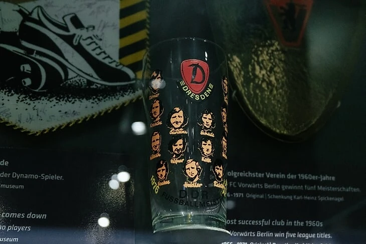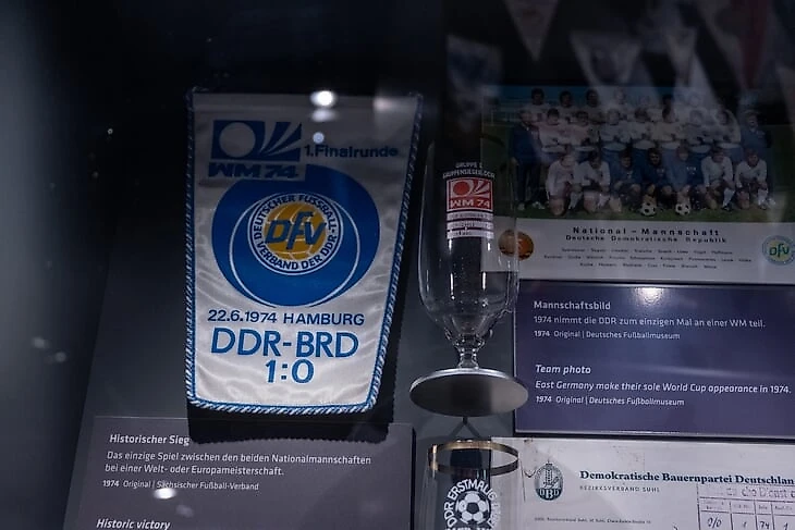 Отдельная часть «первого тайма» посвящена футболу в ГДР. Здесь посетители могут не только узнать о матчах между двумя немецкими республиками, но и познакомиться с клубами восточной Германии. Одна из витрин также рассказывает о «спортивных предателях» – о футболистах и тренерах, которые сбежали в ФРГ.