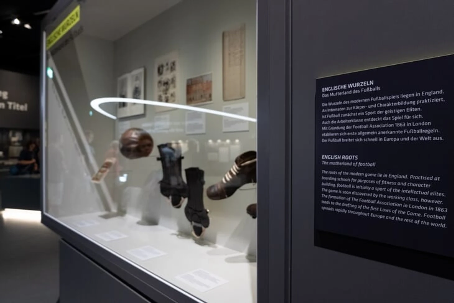 Перед тем, как продолжить повествование о футболе в Германии, музей рассказывает посетителям, как все начиналось. Отдельная витрина посвящена родине футбола – Англии. Первые матчи, первые бутсы, печатки и мяч.