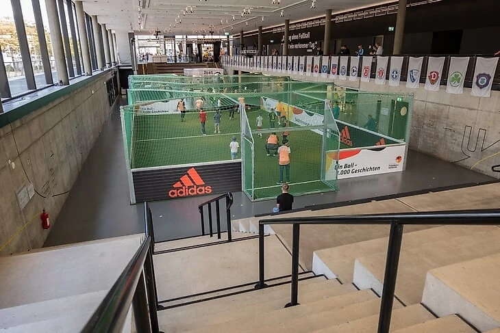 Экспозиция расположена на трех этажах общей площадью 7 тысяч квадратных метров. Она делится на пять частей: «перед игрой», история сборной Германии в секции «первый тайм», часть «перерыв» посвящена легендарным тренерам и их тактике, в секторе «второй тайм» посетителям рассказывают историю бундеслиги и показывают знаковые события из жизни немецкого клубного футбола. А завершает экспозицию развлекательная зона «после игры».
