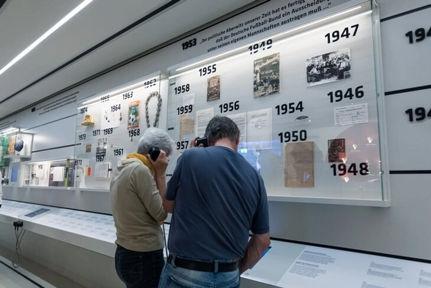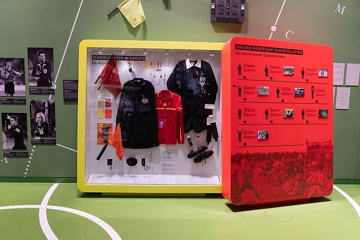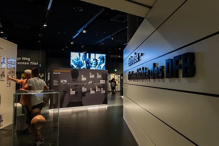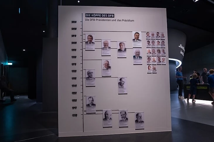 С правой стороны зала «первый тайм» история основания Немецкого футбольного союза (DFB) и основные события в его жизни. Открывает эту часть выставки стенд с «генеалогическим древом», на котором изображены все президенты DFB.