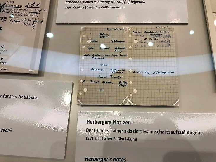 Фрагмент из записной книжки главного тренера сборной Зеппа Хербергера, 1951. Рядом с этими экспонатами есть небольшой интерактив – квиз (увы, на немецком), где посетителю предлагают выбрать правильное продолжение известных цитат тренера.