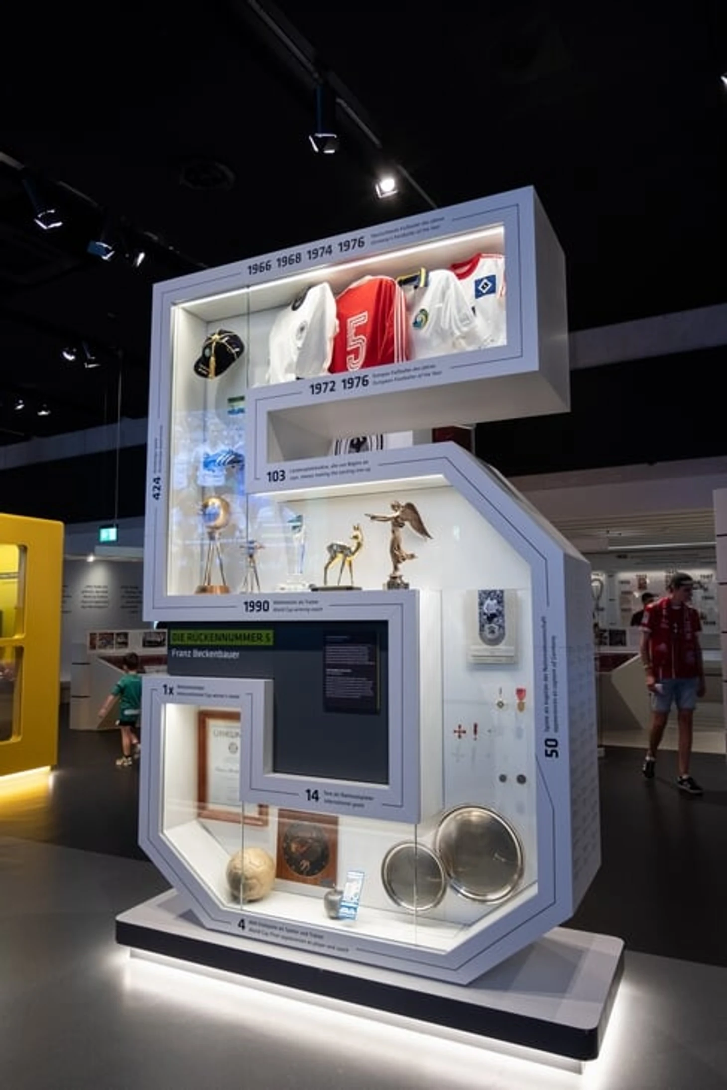 Номер 5 – значит Беккенбауэр. У легенды немецкого футбола Франца Беккенбауэра отдельный стенд в центре зала. Все титулы, все этапы его карьеры в качестве игрока и в качестве тренера. 424 матча в бундеслиге, лучший игрок года Германии 1966, 1968, 1974, 1976, лучший футболист Европы 1972 и 1976. 103 матча за сборную ФРГ, из них 50 в качестве капитана команды, он всегда был на поле со стартового свистка.