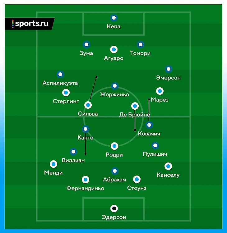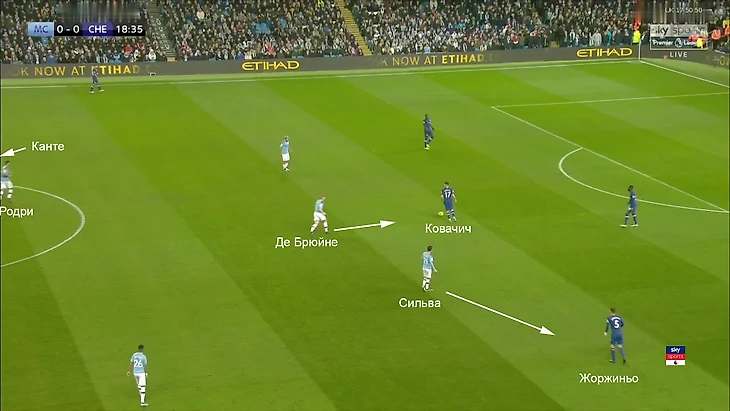 Обычно «Сити» использует зонный прессинг, где футболисты подстраиваются под положение мяча и партнеров. Но на этот раз в центре поля была персональная игра – Давид Сильва против Жоржиньо, КДБ против Матео Ковачича и Родри против Канте: