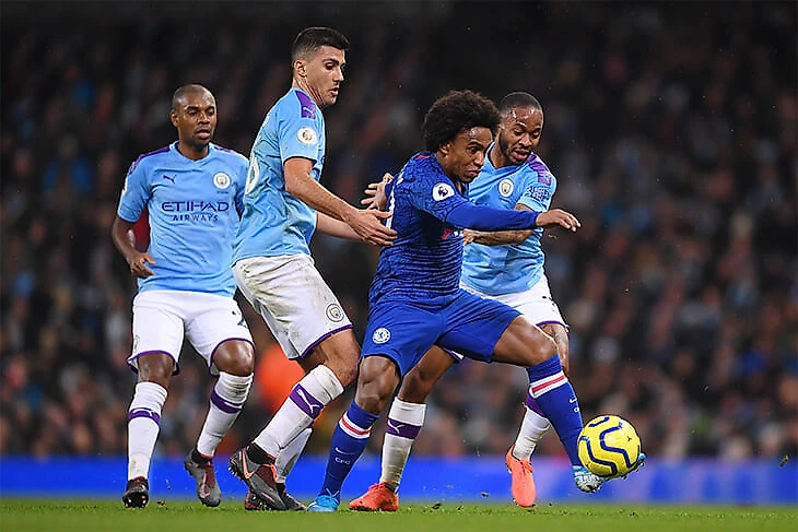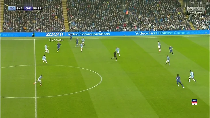 Виллиан старается ускорить атаку обострением, хотя в этом нет особого смысла. Из-за количества обороняющихся игроков «Сити» «Челси» разумно просто делать атаку позиционной и расставляться соответствующим образом: