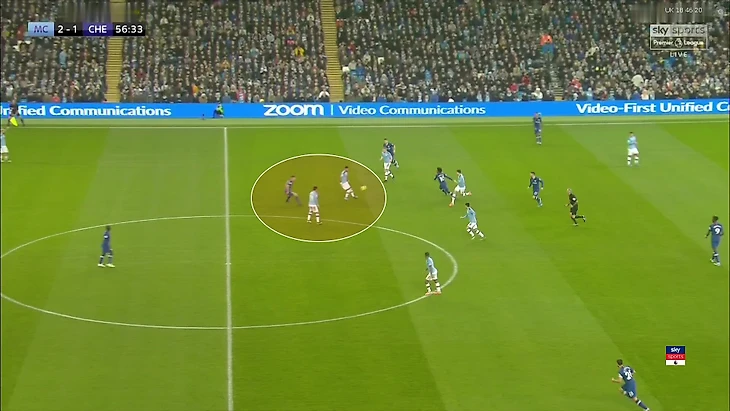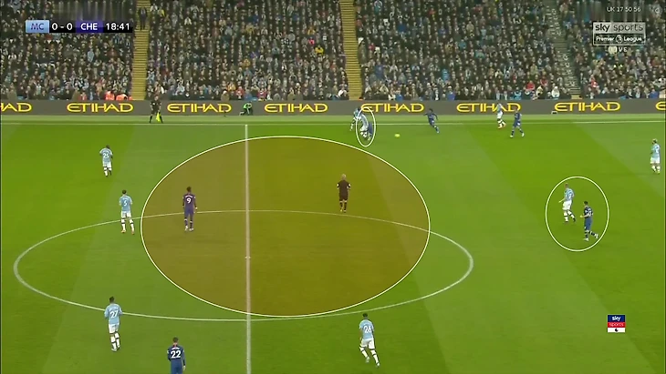 Такая модель вела к проблемам. Главная из них – балансирование между защитой опорной зоны и персональной игрой. Грубо говоря, КДБ нужно было постоянно принимать трудные решение – либо бросать зону и идти за Ковачичем, либо дать свободу хорвату. Проблемы возникали в двух сценариях. Вот так «Челси» оголял опорную, если «Сити» играл слишком плотно: