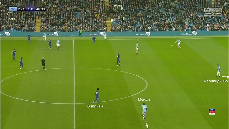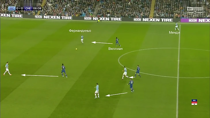 Во-вторых, «Сити» был лучше готов к позиции Виллиана при прессинге. Фернандиньо и Менди «растягивали» его. Они максимально отдалялись друг от друга – Менди уходил во фланг, а Фернандиньо назад. У Виллиана не оставалось возможности прессинговать Ферну и оглядываться на Менди, понимая, что при необходимости его тоже можно накрыть. Приходилось выбирать одного: