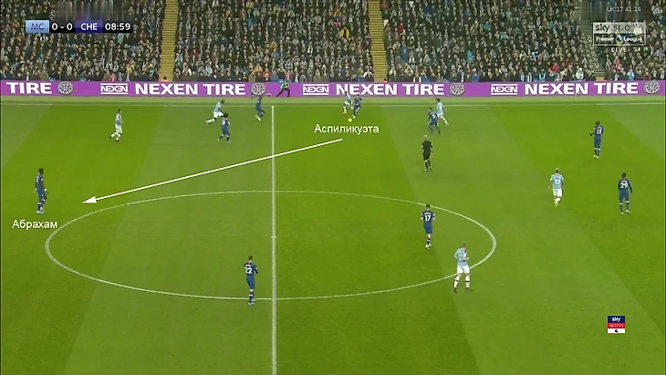 Второй способ вскрытия «Сити» – быстрые атаки по продуманному сценарию. Как описано выше, прессинг Лэмпарда перекрывал центр и направлял «Сити» на фланги. Там у «Челси» максимально агрессивно действовали крайние защитники (Аспиликуэта и Эмерсон) – после отбора следовал пас на Тэмми через свободную опорную зону «Сити»: