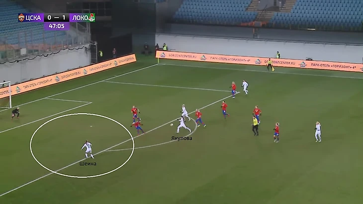 На 44-й минуте травму получила Эльвира Тодуа, и место в воротах ЦСКА заняла Анастасия Ананьева. Ей практически сразу же пришлось вступать в игру. В этом эпизоде Якупова стянула на себя игроков соперника и решила пробить, Ананьева потащила. Возможно, следовало отдать передачу на свободную Шеину: