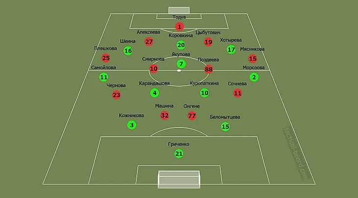 Зиновьев решил сыграть с двумя форвардами, выпустив на поле одновременно Наталью Машину и Габи Онгене. В последних матчах выходил кто-то один из них. На правом фланге одновременно вышли Юлия Плешкова и Ольга Чернова, обе номинально фланговые защитницы.