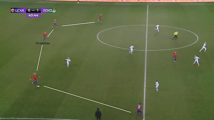 При розыгрыше мяча Поздеева опускалась к паре центральных защитников, оставляя опорную зону на откуп Смирновой: