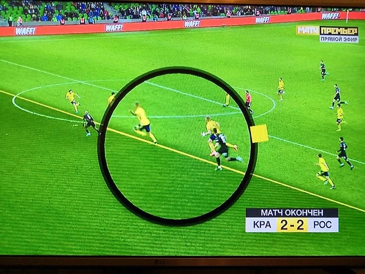 Чуть позже выяснилось, что видеопомощники оценивали момент по другой картинке, а эту желтую линию неверно нарисовал «Матч ТВ».