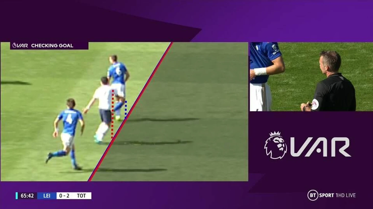 Это проговаривалось не один раз, но стоит зафиксировать: линии офсайда никак не зависят от телевидения. Видеосудьи чертят их совместно с реплэй-оператором с помощью софта HawkEye. Вы сами легко можете определить, какой стоп-кадр вам показывают: если по ноге защитника проходит синяя линяя, по ноге форварда красная (с проекцией), то это, вероятно, скрин, на который смотрели судьи.
